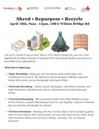 Residents can bring confidential documents for secure shredding, along with many types of electronics for recycling and destruction. We’ll also have organizations for prom dress collection and furniture donations, which makes this a one-stop opportunity to declutter with purpose.
